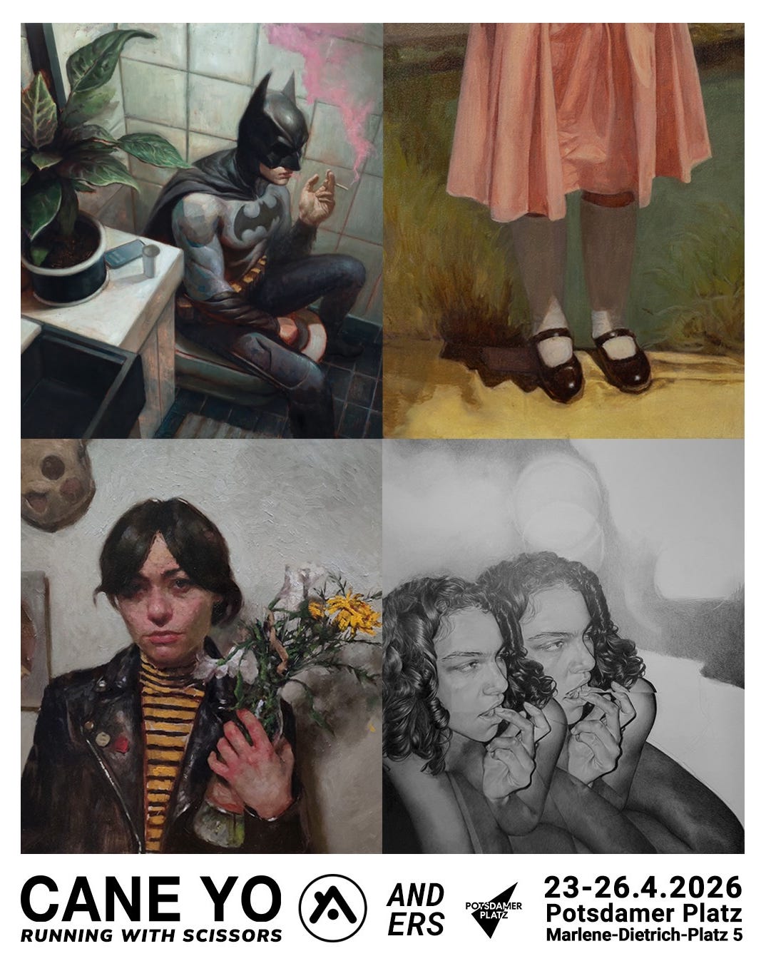 A pop-up group exhibition at the Atrium Tower. CANE YO is an international artists' collective that formed online through shared sketchbooks and open digital exchange. "Running with Scissors" brings together work from 40 collective members from around the world alongside 5 invited Berlin artists. The practice spans figurative painting, drawing, and digital media, exploring the tension between internet-saturated visual culture and the physical act of making images by hand. More info.