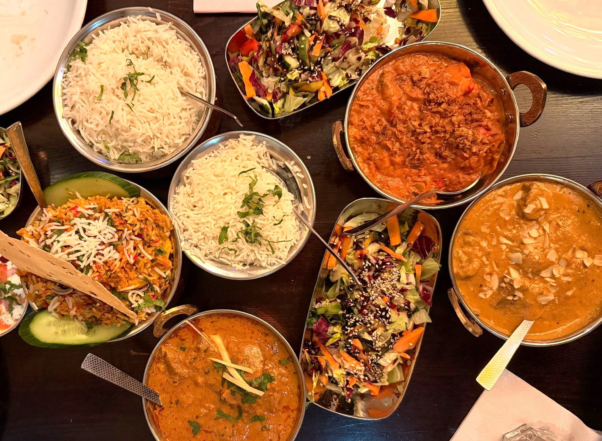 Talking to my Indian friends, it seems hard to find authentic, home style Indian food in Berlin, since many restaurants have westernized their dishes to match local tastes. I recently tried this Indian restaurant, and the food was acceptable. They are conveniently located by Uber Arena, meaning that if you are going to a concert, this can be a good spot for dinner beforehand, especially if you are a big group. There is plenty of seating and the staff is very attentive and friendly. We asked them not to charge for a glass of cola because it was flat, and they agreed without any fuss. The chicken biryani was nice with a generous portion of chicken. The lamb dishes were also good with the right level of spiciness. The chicken stew was just okay and felt a bit bland. Most dishes come with a side salad, and they accept card payments. Overall, this is an acceptable place if you want a convenient location to eat before a concert at Uber Arena.