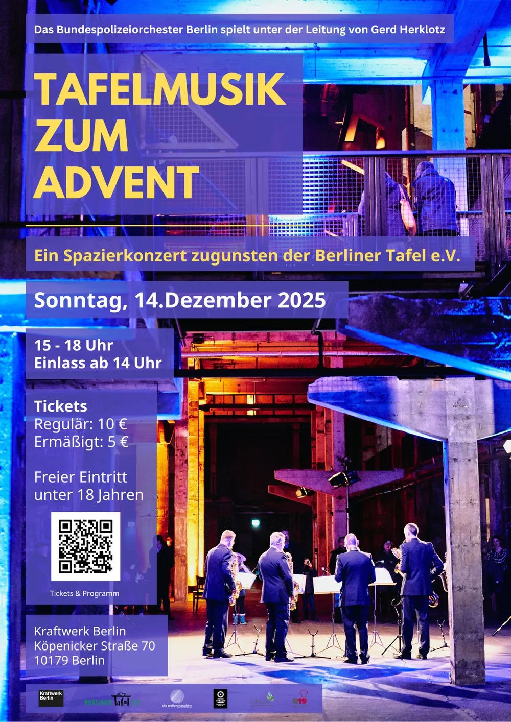 The walking concert Tafelmusik zum Advent returns to Kraftwerk Berlin, where the Bundespolizeiorchester performs under the direction of Gerd Herklotz in support of Berliner Tafel. The event brings the orchestra into a venue known for contemporary electronic music, creating an unusual meeting point between two different musical environments. You can move through the power station as the concert unfolds, with a program that spans both classical and modern influences presented in a single setting. More info.