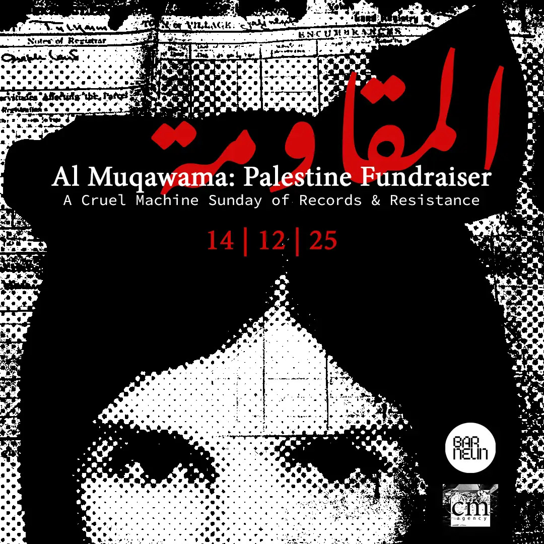 New wave and experimental sounds with a pop-up record market. Record label Cruel Machine presents a special solidarity edition: a full fundraiser for the Hind Rajab Foundation, supporting the documentation of war crimes in Gaza and the pursuit of legal accountability. Bringing together artists across North African rhythms, experimental electronics, ambient performance, SWANA diasporic grooves, industrial textures, and raw club energy, the event creates a sonic space where mourning, resistance, and collective care converge. A solidarity record market accompanies the night, with all proceeds directed to the fundraiser. More info.