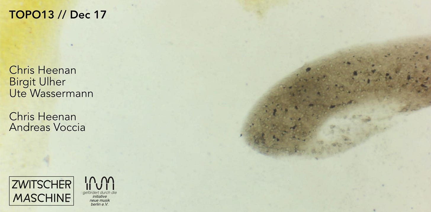 This small and cozy concert presents two sets of improvised music that examine how sound spaces form and change. The concept draws from topology, which studies how spaces can transform while keeping their essential qualities. Musicians work together to build these sound environments through spontaneous performance, with the interaction between performers and listeners shaping what happens. The first part features Chris Heenan, Birgit Ulher, and Ute Wassermann, while the second part pairs Heenan with Andreas Voccia. More info.