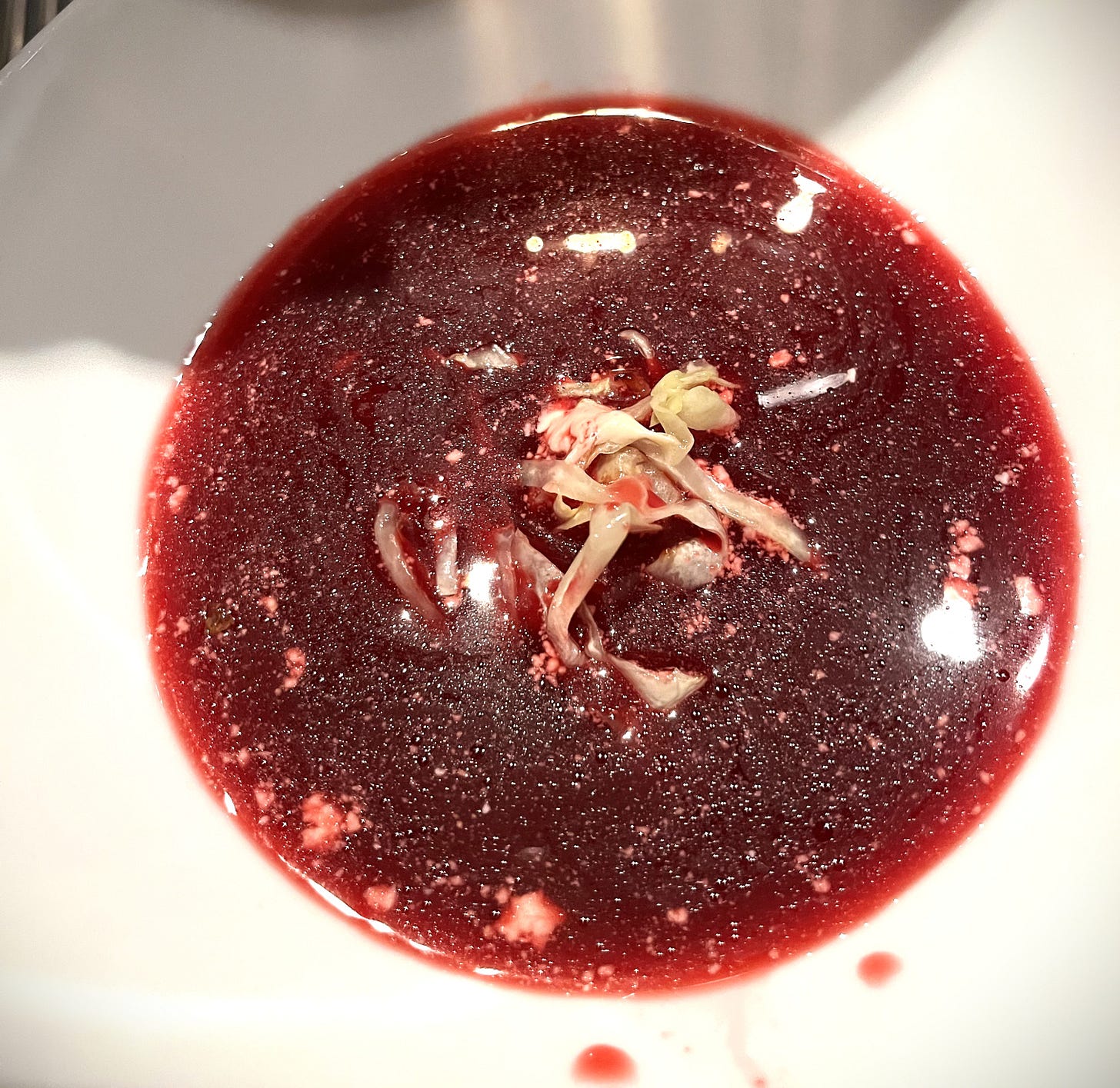 Beet root tea: Smoked sour cream, sautéed pointed cabbage, walnut, ginger (⭐3.5/5)