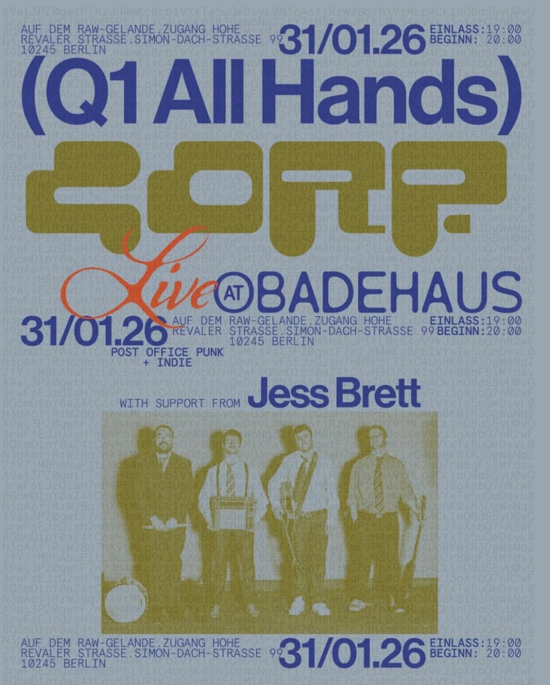 CORP. celebrates their four-year anniversary with their biggest headline show at Badehaus. The Berlin-based indie rock and post-punk band has performed across Europe at venues including Whelans in Dublin, Paradiso in Amsterdam, and a sold-out album release show at Kantine am Berghain. Their sound blends influences from Beach Fossils, Surf Curse, Talking Heads, and The Strokes. Jess Brett provides support for the evening. More info.