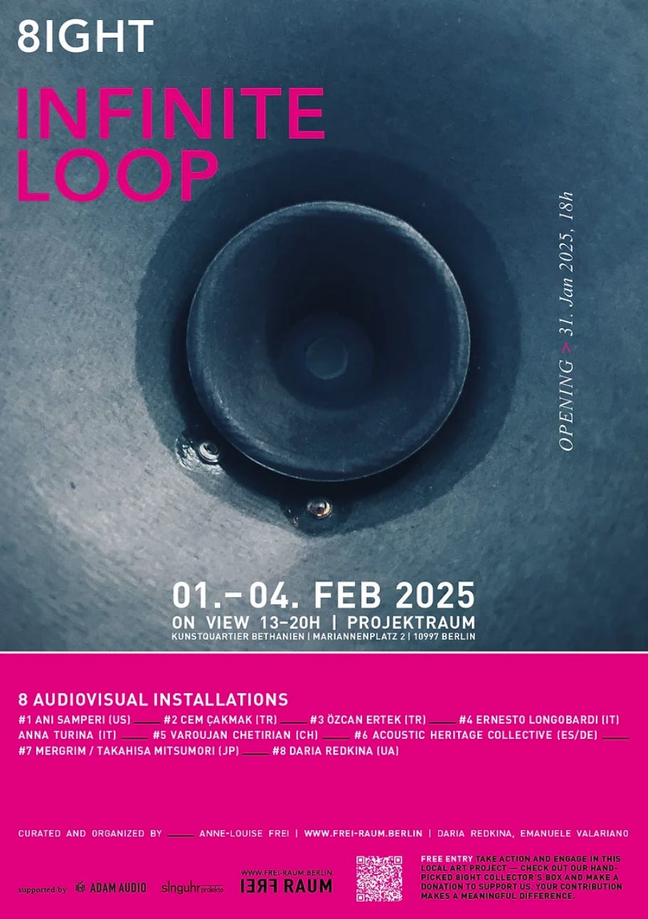 The 8ight, INFINITE LOOP exhibition brings together works from eight artists, each exploring the themes of systems and infinity through evolving acoustic sources. Set in Projektraum Kunstquartier Bethanien, these works form an environment where each piece interacts with the others, creating a tangible experience of cyclical processes, systemic interactions, and constant change. More info.
