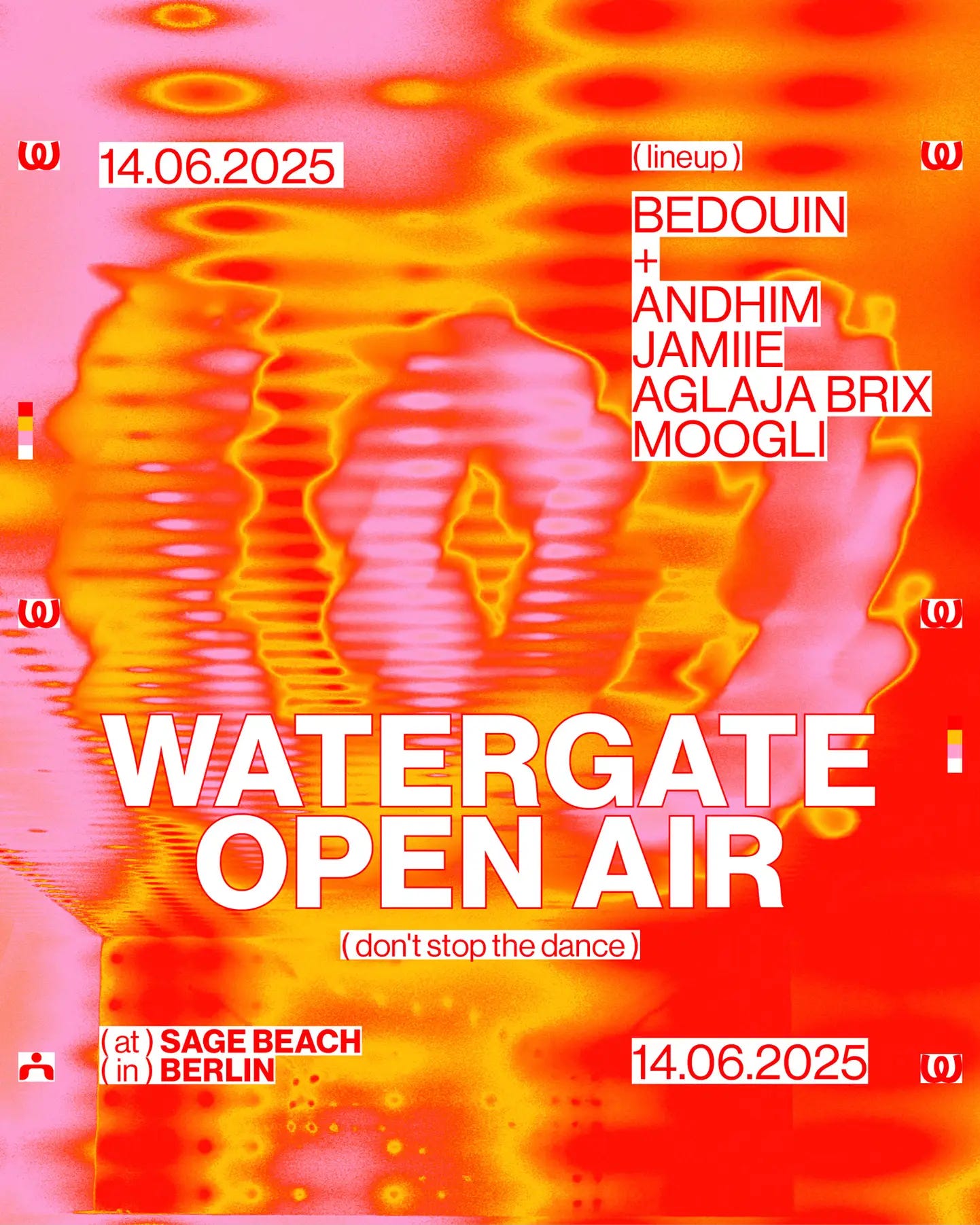 WATERGATE returns with an open-air event at SAGE Beach, bringing together two stages of music along the river in Kreuzberg. The main beach floor features sets from BEDOUIN, ANDHIM, and AGLAJA BRIX, while the container stage hosts JAMIIE and MOOGLI. The event runs from day into night, with an aftershow starting at 10 PM. More info.