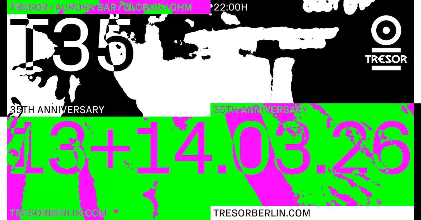 Tresor marks 35 years since its founding in 1991 with a 30-hour+ marathon event across four venues: Tresor, Globus, OHM, and Aurora Bar. The program begins Friday night with Adriana Lopez, Blake Baxter, and Function live in Tresor and Globus, continues through Saturday and Sunday with a daytime session at OHM featuring Fumiya Tanaka and Daniel Bell, and more djs. More info.