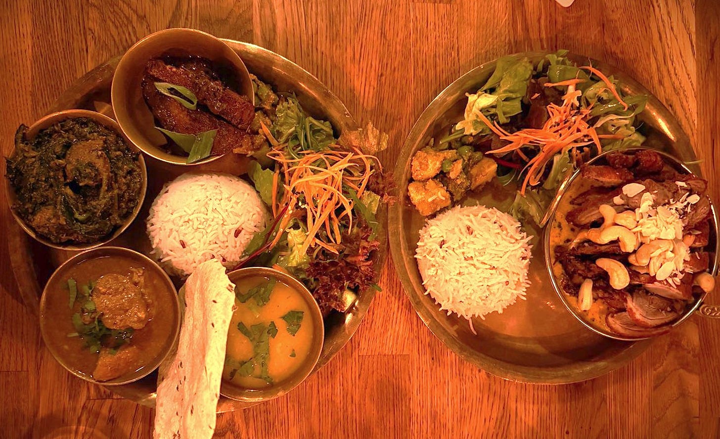 This Nepalese restaurant has two locations, one in Prenzlauer Berg and one in Neukรถlln. I visited the Neukรถlln branch. The space is large, clean, and they allow online reservations, which makes planning easy. The menu has a good variety of dishes. Some are similar to Indian cuisine but with their own twists and different levels of spice. We tried their national dish, which comes as a set of small plates with beef, chicken, vegetarian sides, soup, rice, and a type of bread. They also have this available as vegan. It is a nice way to try several things at once. We also ordered the fried duck in a curry-style sauce and nuts, which was quite good. The staff are friendly and speak English, the prices are around โฌ23 per person including a soft drink, and they accept cards.