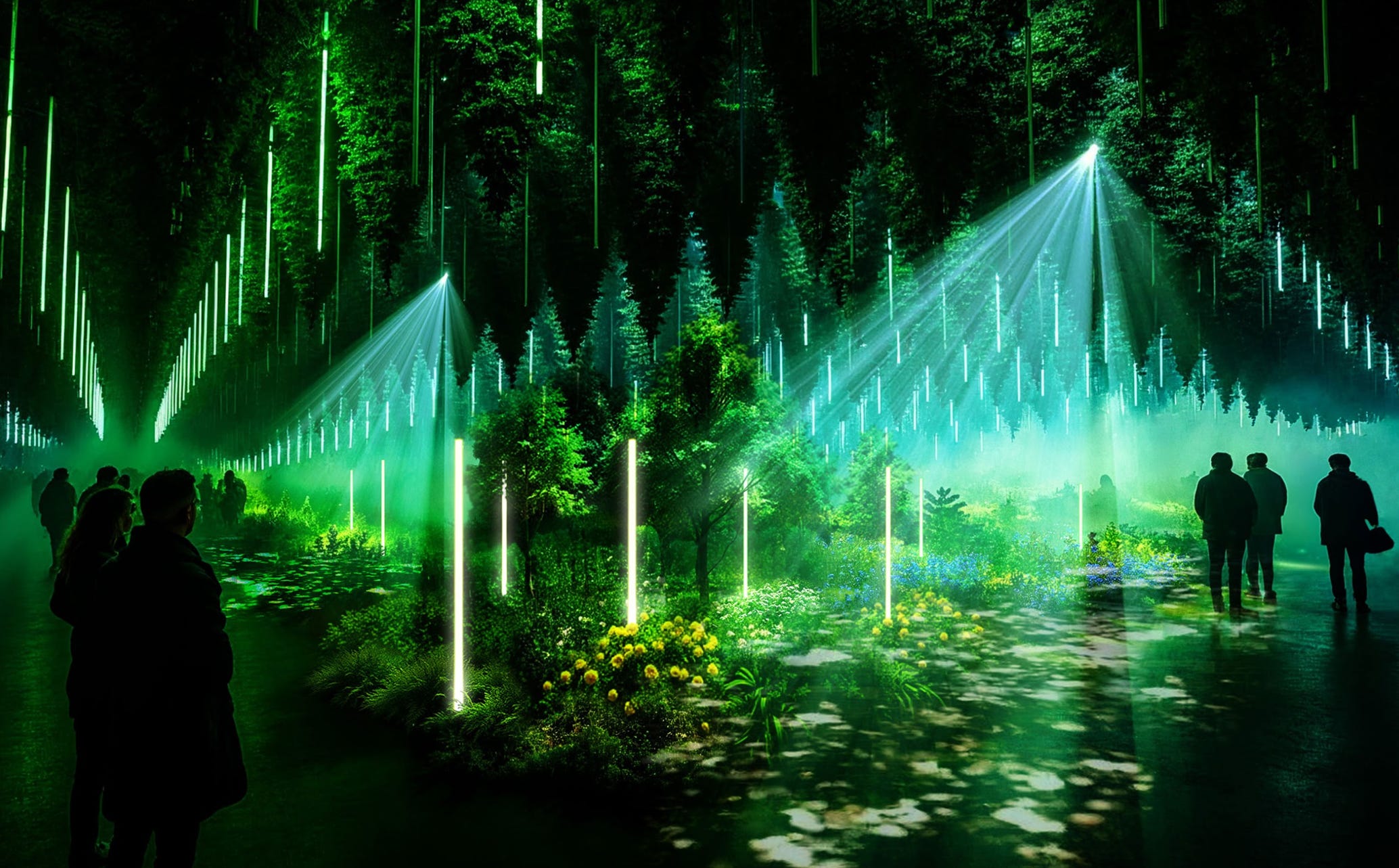 At DARK MATTER, light and media artist Christopher Bauder fills the space with a walk-through installation that treats the forest as a changing emotional landscape. Laser light, projections, moving elements, and music run through a roughly 45-minute cycle of spring, summer, autumn, and winter, shifting mood from growth and brightness toward stillness. More info.