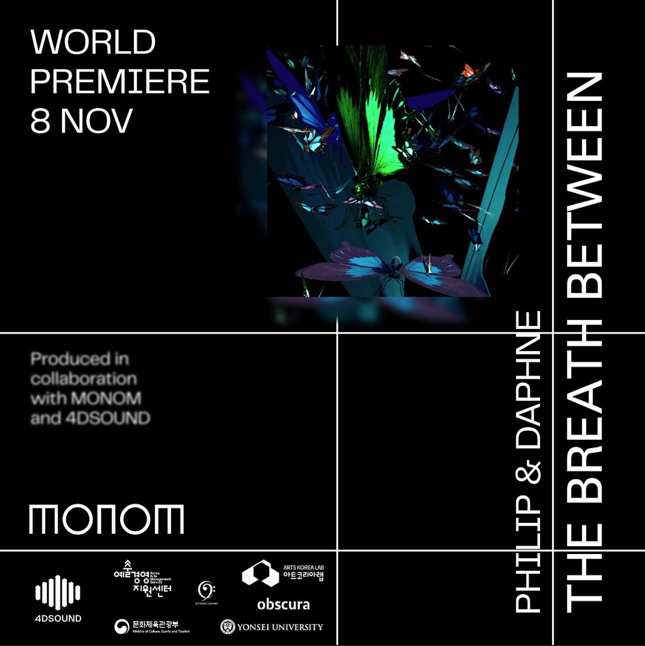 The Breath Between is a new audiovisual installation by the artist duo Philip and Daphne, presented in collaboration with MONOM and 4DSOUND. The piece combines spatial sound, projection mapping, and holographic imagery, built from live piano recordings. The piano recordings are processed into a shifting sound environment that surrounds visitors, while the visual component grows into Moving Sculpture, where light and form appear to hover in space rather than sit on a surface. The result is a shared field in which sound and image respond to one another, creating a continuous experience rather than separate layers. More info.