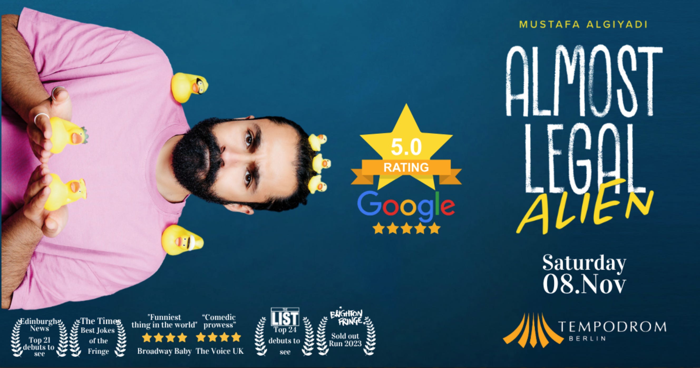 Mustafa Algiyadi, a standup comedian based in Munich, brings his critically acclaimed solo hour to Berlin as he navigates the cultural clashes between his Arab roots and European life. The show dissects topics of identity and the search for a better passport, all delivered with a semi-intellectual flair that adds to the severe imposter syndrome he has. More info.