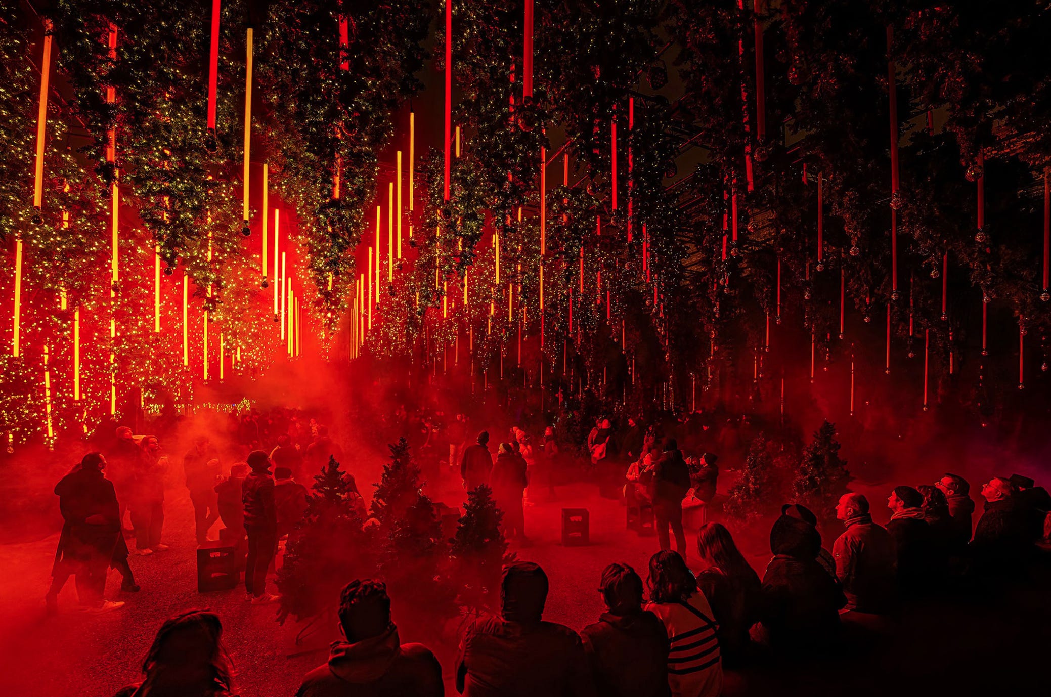 DARK MATTER opens the winter season with FOREST WINTERLIGHTS, a large-scale light installation that spans about one thousand square meters and features more than 600 trees, many suspended from the ceiling, and over 250,000 lights. The space functions as a staged environment where light and sound form the narrative, including a central motif of the upside down fir tree that references historical traditions in parts of Europe. A four hundred square meter ice rink threads through the installation, with skate rentals available on site. More info.