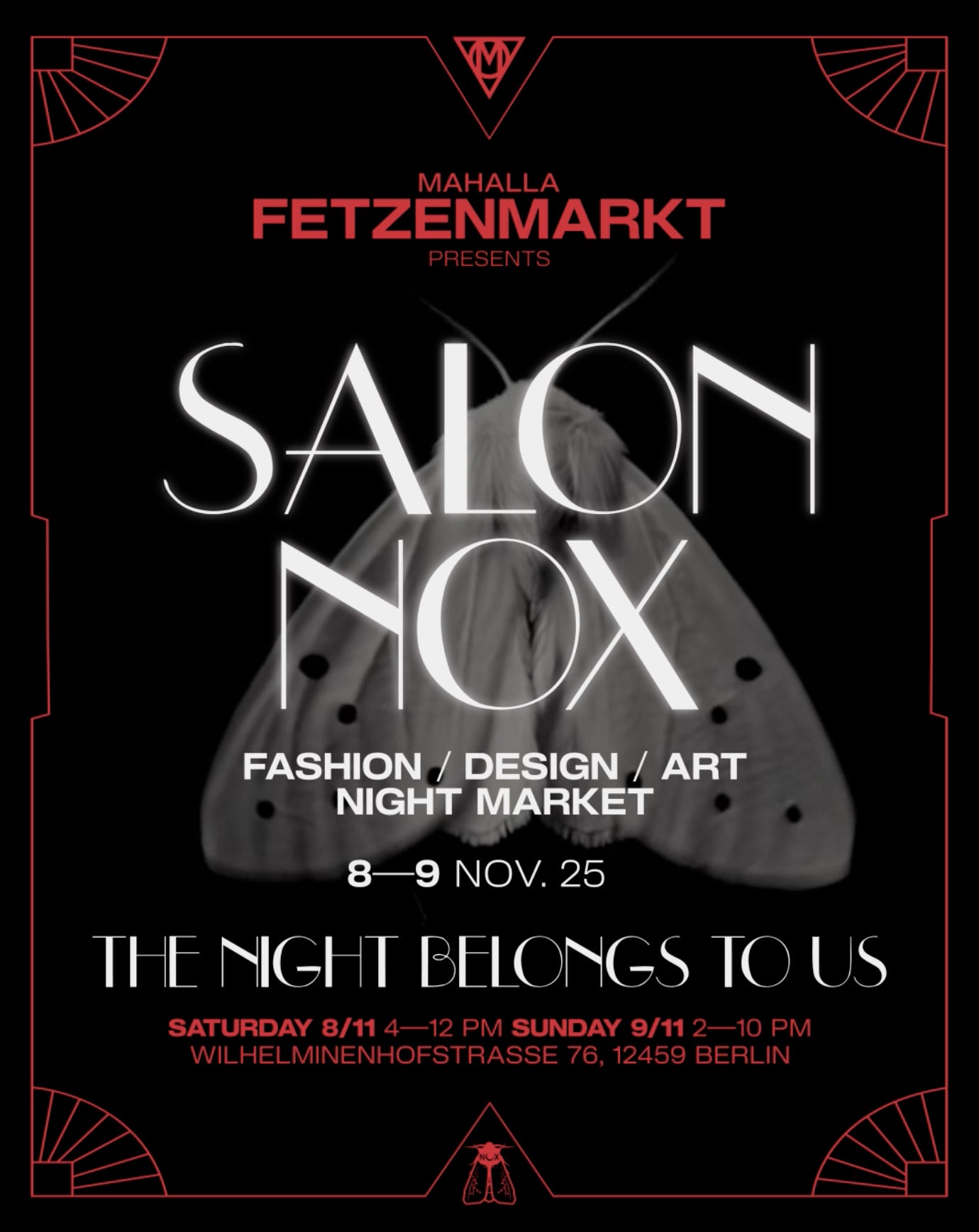 MaHalla FETZENMARKT returns with Salon Nox, a marketplace that links fashion, design, and art in MaHalla’s industrial halls. Across two evenings, you can browse independent labels and vintage pieces, watch performances, listen to music, and meet makers and fellow guests while bars operate throughout the venue. The program is designed as a social market where shopping, conversation, and nightlife overlap, welcoming an audience that values style and culture without strict boundaries between them. More info.