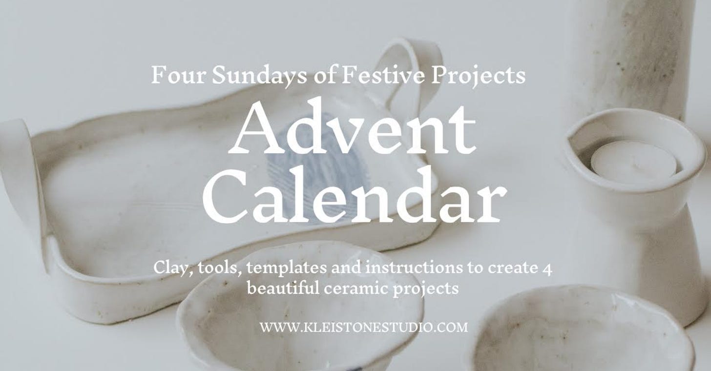 Looking for a different kind of advent calendar this season? The Kleistone Studio Advent Calendar is a great chance to get creative. It contains clay, tools, templates and hand-illustrated instructions (in German and English) to make 4 ceramic projects during the winter months. Also a great Christmas gift! The set containing all projects ships in time for the first advent. More info.