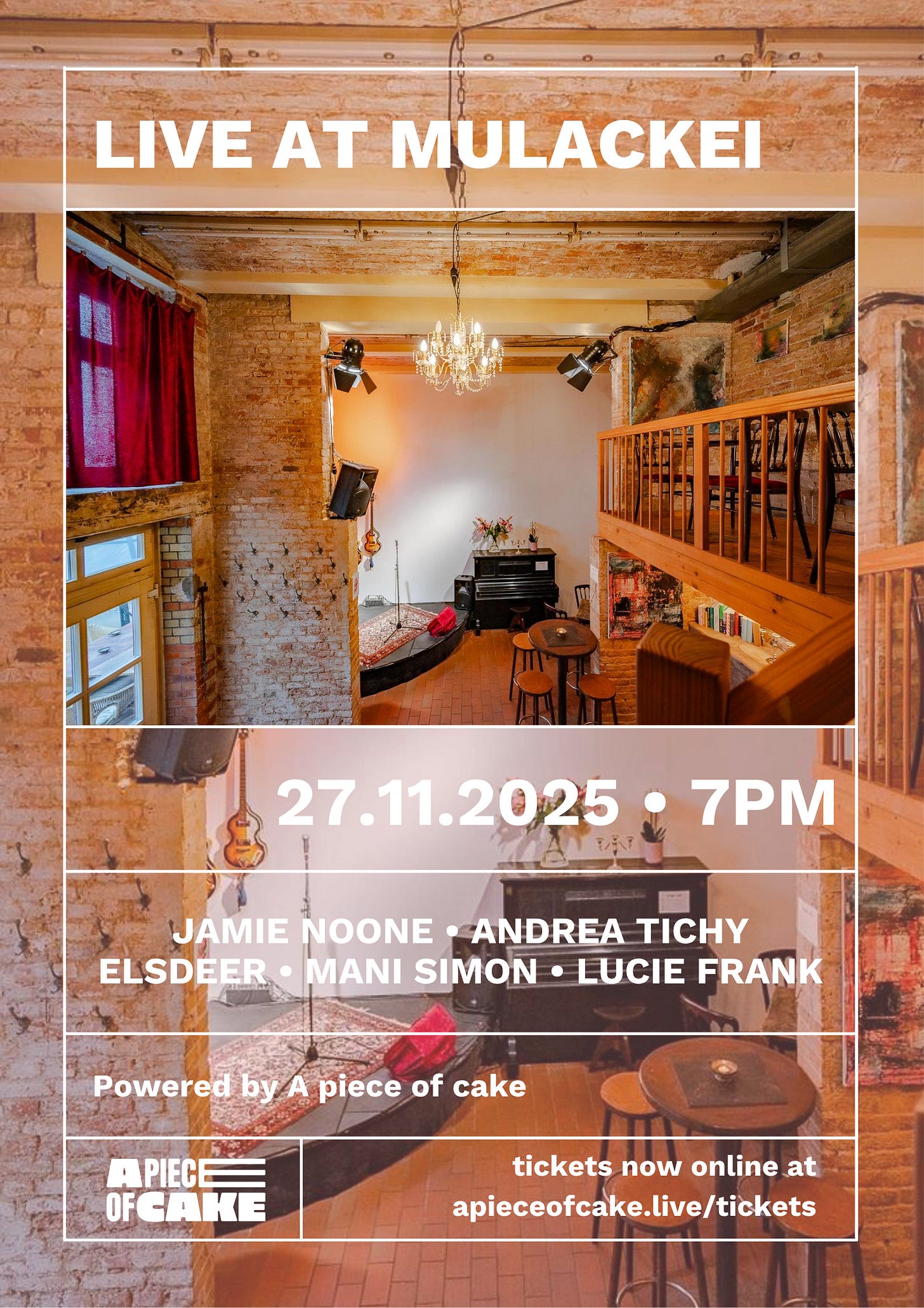 The showcase night brings together a small group of musicians at Mulackei, an intimate venue in Berlin Mitte. Lucie Frank, Mani Simon, Jamie Noone, Andrea Tichy and Elsdeer will perform, supported by A Piece of Cake, a playback pedal used for live sets. A piece of cake is a new music hardware company from Berlin doing things differently. More info.