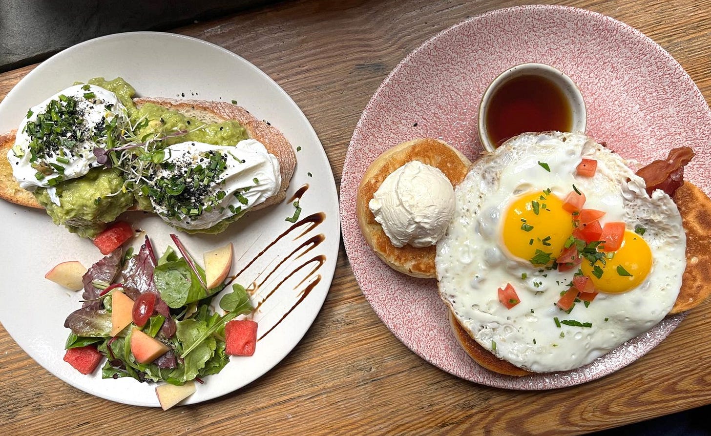This is a neighborhood brunch spot where people often line up on weekends. They do not take online reservations, but there are a few larger tables for groups. The food is consistently solid, the portions are generous and the menu is straightforward. They are very generous with avocado, both in the smash and even when ordering extra. Gluten-free options are available, and the coffee is reliably good. Prices are a bit higher than the usual brunch place, which likely comes down to the location rather than the portion size or quality. The crowd is a mix of locals and tourists, so you hear many languages while you eat.