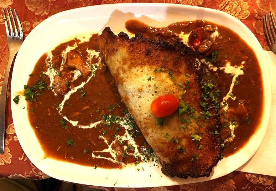 The dishes might not look 'designed,' but the taste is pretty good. This is a potato pancake with Goulash. The pierogies are pretty good too.